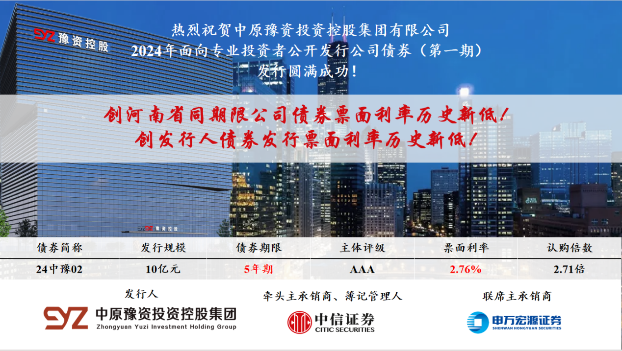 熱烈祝賀中原豫資投資控股集團有限公司2024年面向專業(yè)投資者公開發(fā)行公司債券(第一期)發(fā)行圓滿成功!2024年3月6日,中原豫資投資控股集團有限公司(以下簡稱“本集團”“豫資控股集團”)2024年面向專業(yè)投資者公開發(fā)行公司債券(第一期)(以下簡稱“本期債券”)成功簿…...