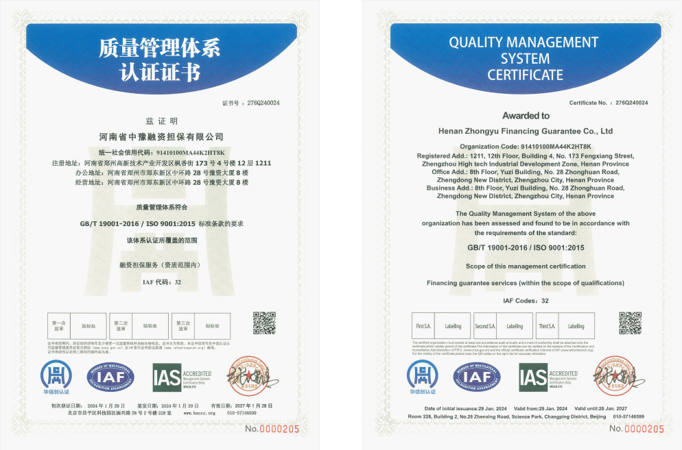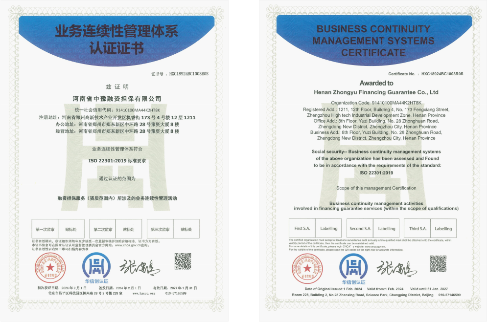近日,河南省中豫融資擔保有限公司(簡稱“公司”)正式通過質量管理、信息安全管理、業務連續性管理審核評定,獲ISO90001質量管理體系、ISO27001信息安全管理體系和ISO22301業務連續性管理體系等三項體系標準認證證書,昂揚奮進地打開2024年新局面。