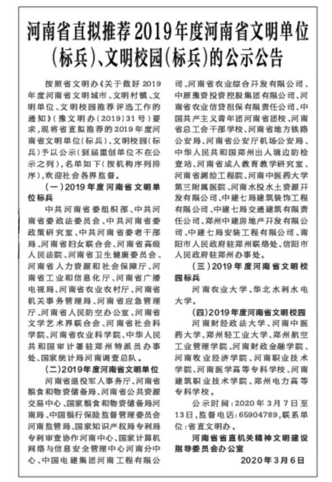 ?3月6日,河南省直機(jī)關(guān)精神文明建設(shè)指導(dǎo)委員會辦公室對擬推薦2019年度河南省文明單位(標(biāo)兵)、文明校園(標(biāo)兵)進(jìn)行公式公告,其中中原豫資投資控股集團(tuán)有限公司擬推薦為2019年度河南省文明單位。2019年,豫資控股集團(tuán)在河南省直文明辦、省財政廳文明辦的指導(dǎo)與幫助下,始…